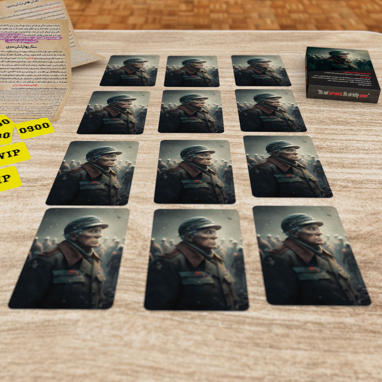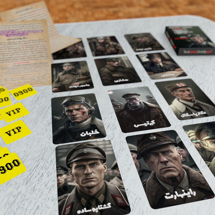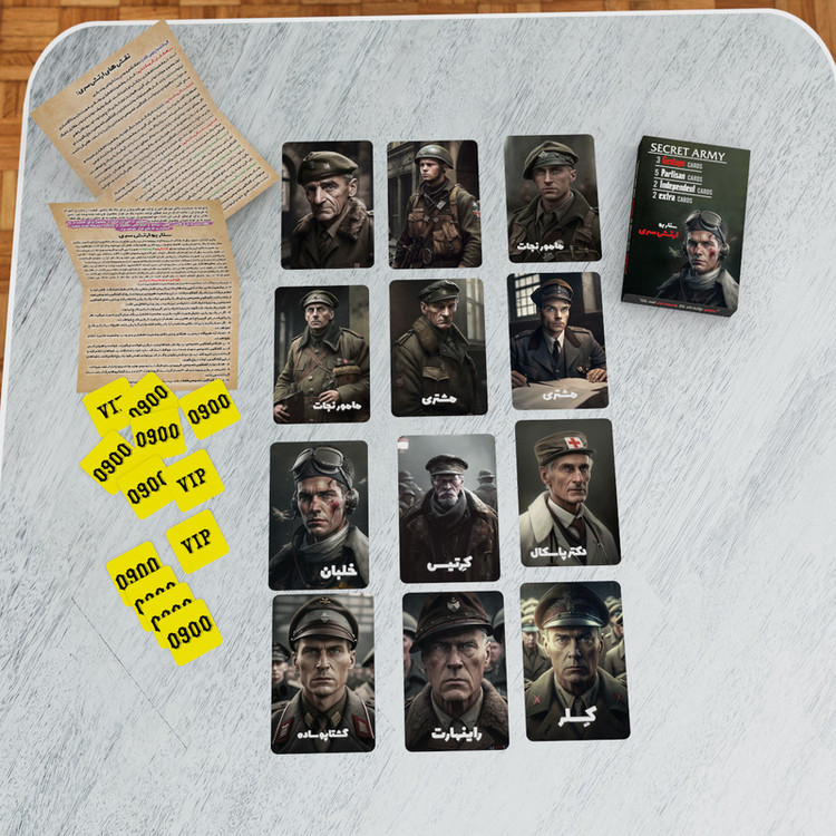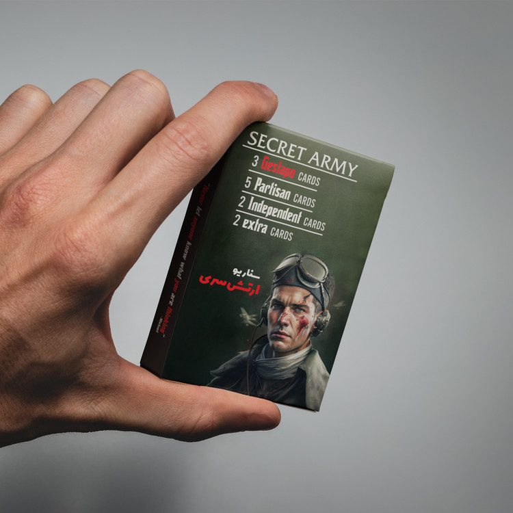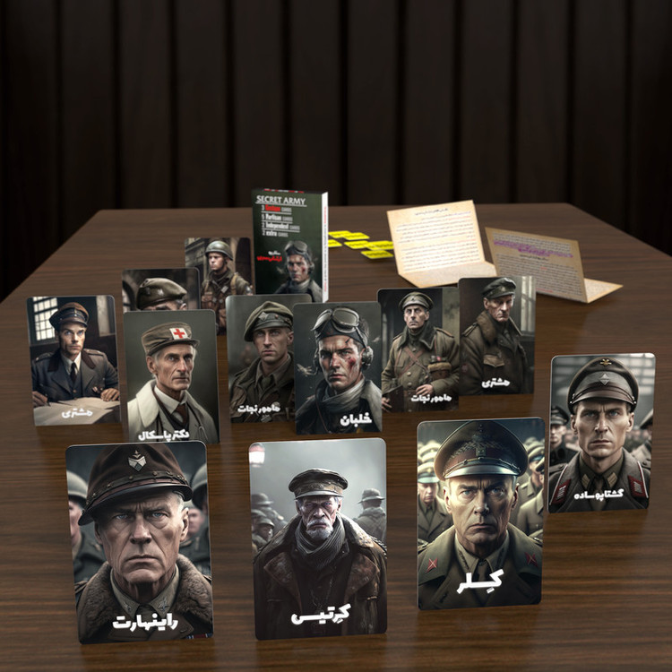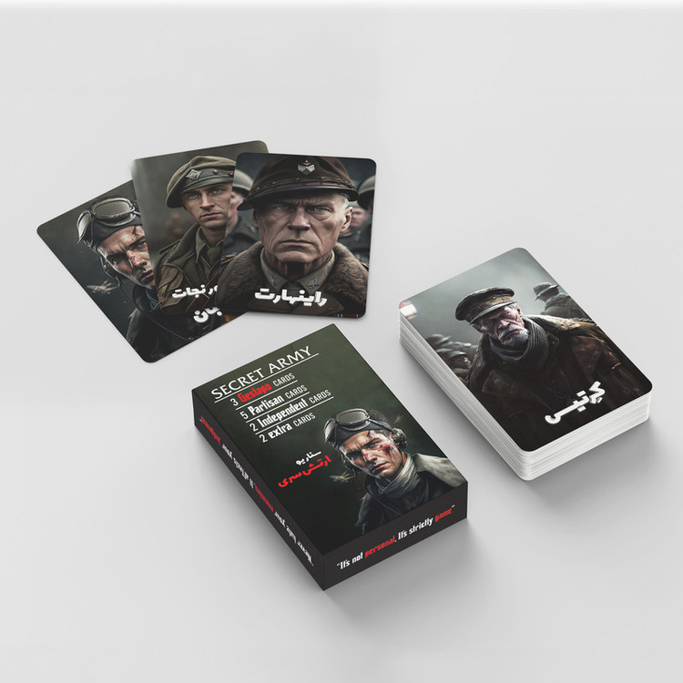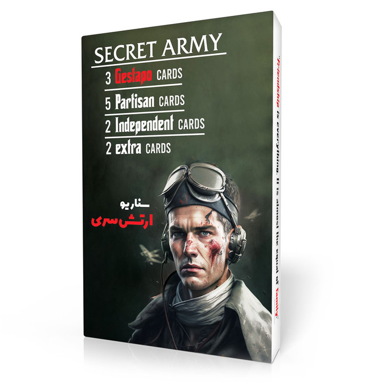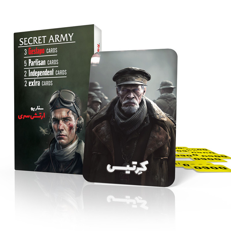 بازی فکری مدل ارتش سری دارای 12 کارت بازی و 12 کارت مخصوص اتاق گفتگو میباشد ( 3 کارت تیم گشتاپو ، 5 کارت تیم نجات ، 2 کارت مستقل (مشتری) ، 12 ژتون اتاق مخصوص ، 2 کارت بی نام ) مجموعه کارتها برای بازی 12 نفری به همراه گرداننده به روش سناریو ارتش سری فیلیمو طراحی و تولید شده است . برای آموزش روش بازی و توضیح نقشها ، برگه راهنما درون محصول مفصل توضیحات را ارائه میدهد ، قصد اولیه طراحی و تولید این محصول صرفا کمبود کارت کامل و مقرون به صرفه در بازار بود ، در نتیجه پس از استقبال علاقه مندان و دریافت نظرات متعدد ، اقدام به تولید این محصول نیز نمودیم . جنس کارتها لمینیت دورو چاپ با روکش سلفون مات بوده که مقاومت آنها را چند برابر می کند.