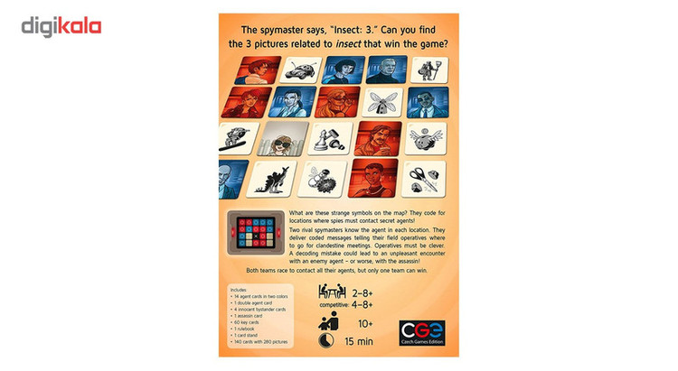 یکی از قدیمی ترین و منحصر به فرد ترین شیوه های ارتباط بشر کلمات رمزی هستند! در یک موقعیت خاص امنیتی دو تیم نظامی منتظر هستند تا جاسوسان خود را از معرکه خارج کنند. هر تیم منتظر است تا مشخصات و موقعیت سوژه به او اعلام شود و فورا او را خارج کند..... اما صبر کنید یک جای کار می لنگد! تیم مقابل دارد بیسیم ما را شنود میکند! حالا راه حل چیست؟ بیان موقعیت سوژه با کلمات رمزی!بازی codenames یکی از شاهکارهای استاد بزرگ طراحی بازی vaada chvatil و دارنده رتبه اول در بین بازی های گروهی و دور همی در دنیا است. بازی گروهی و دورهمی یا پارتی گیم به بازی هایی گفته میشود که قوانین بسیار ساده داشته و طیف وسیعی از مردم جذب آن ها می شوند، تاکید اصلی آن ها بر جنبه لذت بردن و ایجاد نشاط و هیجان بوده و مناسب نفرات زیاد و مهمانی ها است.در این بازی بازیکنان به دو تیم قرمز و آبی تقسیم می شوند. هر تیم یک سرگروه دارد. سرگروه ها در کنار هم و در یک سمت میز و یاران سرگروه روبروی او و در سمت دیگر میز جای می گیرند. در وسط میز کارتهای بازی چیده میشوند که بیانگر جاسوسانی هستند که باید از موقعیت خارج شوند. روی هر کارت یک تصویر قرار دارد که می توان تعداد زیادی کلمه در مورد آن گفت. در سمت دیگر میز روبروی سر گروه ها یک کارت به شکل ایستاده قرار دارد که فقط برای دو سرگروه قابل مشاهده است و بیانگر موقعیت جاسوس های هر تیم، افراد خنثی و یک کارت قاتل است.هر سر گروه باید با گفتن یک کلمه رمز و یک عدد سعی کند موقعیت کارت های جاسوس تیم خود را به هم تیمی ها انتقال دهد. مثلا: گربه ۳! یعنی در سه تا از کارت ها شکلی وجود دارد که با گربه مرتبط است. در سمت دیگر تیم بازیکنان باید سعی کنند با توجه به پیام دریافتی از سرگروه کارت های مرتبط را شناسایی و جاسوس را فراری دهند. اگر کارت انتخابی صحیح باشد بازی ادامه پیدا کرده و در صورتی که اشتباه باشد نوبت به تیم مقابل است تا همین روند را تکرار کند. برنده بازی تیمی است که زودتر از تیم رقیب تمام جاسوس های خود را شناسایی نماید. البته هر تیمی که اشتباها کارت قاتل را شناسایی کند فورا بازنده است!برای انجام این ورژن بازی نیازی به زبان انگلیسی یا هیچ زبان دیگری ندارید! این بازی فقط از زبان تصاویر پیروی می کند و به شدت هوش تصویری و مفهومی شما را به چالش می کشد. اگر می خواهید برنده باشید باید تمام سعی خود را در مشاهده عمیق تصاویر و مفهوم ها و تبدیل آن ها به کلمات (و برعکس) انجام دهید. تصویر سازی کارت ها به دست یک تیم خبره از قوی ترین گرافیست ها و تصویر پردازان انجام پذیرفته و بازی با ایده ناب و قوانین ساده خود موفق می شود به راحتی جای خود را در دل هر مخاطبی با هر سن و سلیقه باز کرده و حس همکاری و رقابت بسیار قوی ایجاد نماید. در نهایت این بازی را به تمام افراد با هر سن و سلیقه توصیه میکنیم. مطمئن باشید با انجام آن مهمانی های شما رنگ و بوی متفاوتی خواهد گرفت و مدت ها پای ثابت میز شما خواهد بود.